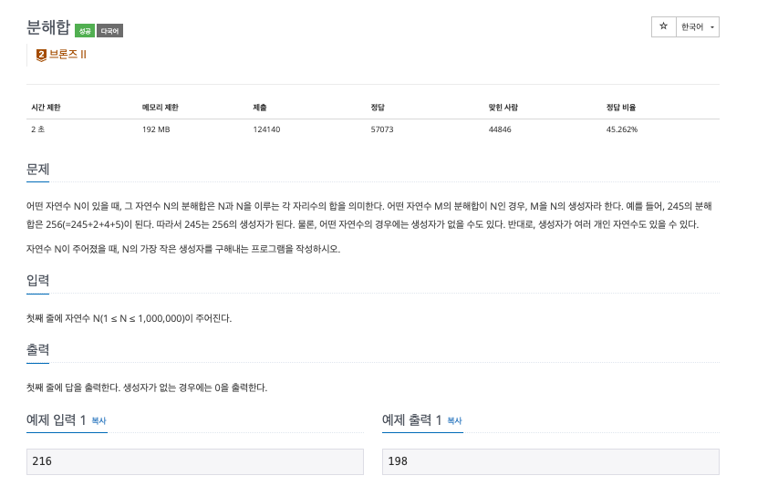 분해합 [ Python ] [ 백준 : 2231 ]