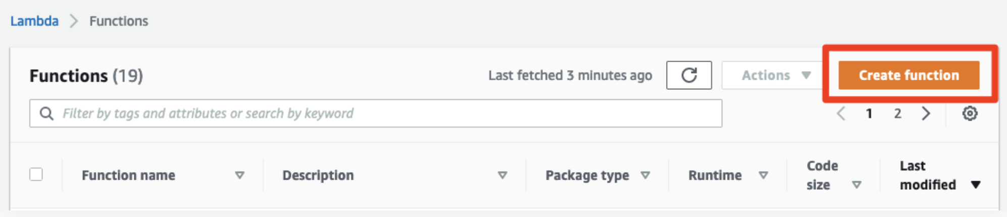Lambda 콘솔에서 오른쪽 메뉴에 있는 Functions 를 눌러서 들어간다.