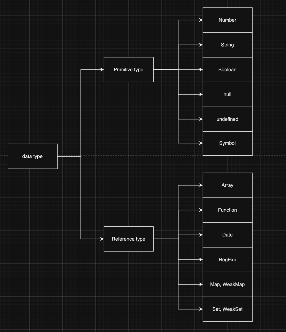 참조형은 객체가 있고, 배열, 함수, 날짜, 정규표현식 등과 ES6에서 추가된 Map, WeakMap, Set, WeakSet 등이 객체의 하위 분류에 속한다.
